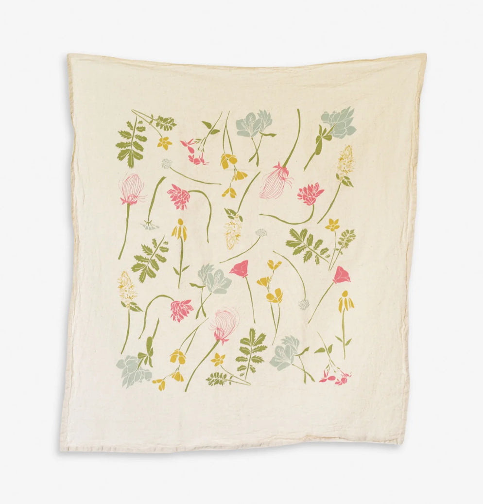 Featuring a pretty pattern of farewell to spring, sulfer cosmos, California poppy, prairie coneflower, California bluebell, prairie smoke, California thrift, silverweed, crescent milk vetch, desert pincushion, nettle leaf horsemint, harlequin lupine, hookers onion and catchfly (or none-so-pretty) wildflowers from the western United States. Screen printed on natural, unbleached flour sack cotton to preserve its uniquely soft, absorbent, and durable nature, this towel is machine washable, allowing it to hold up for everyday use.